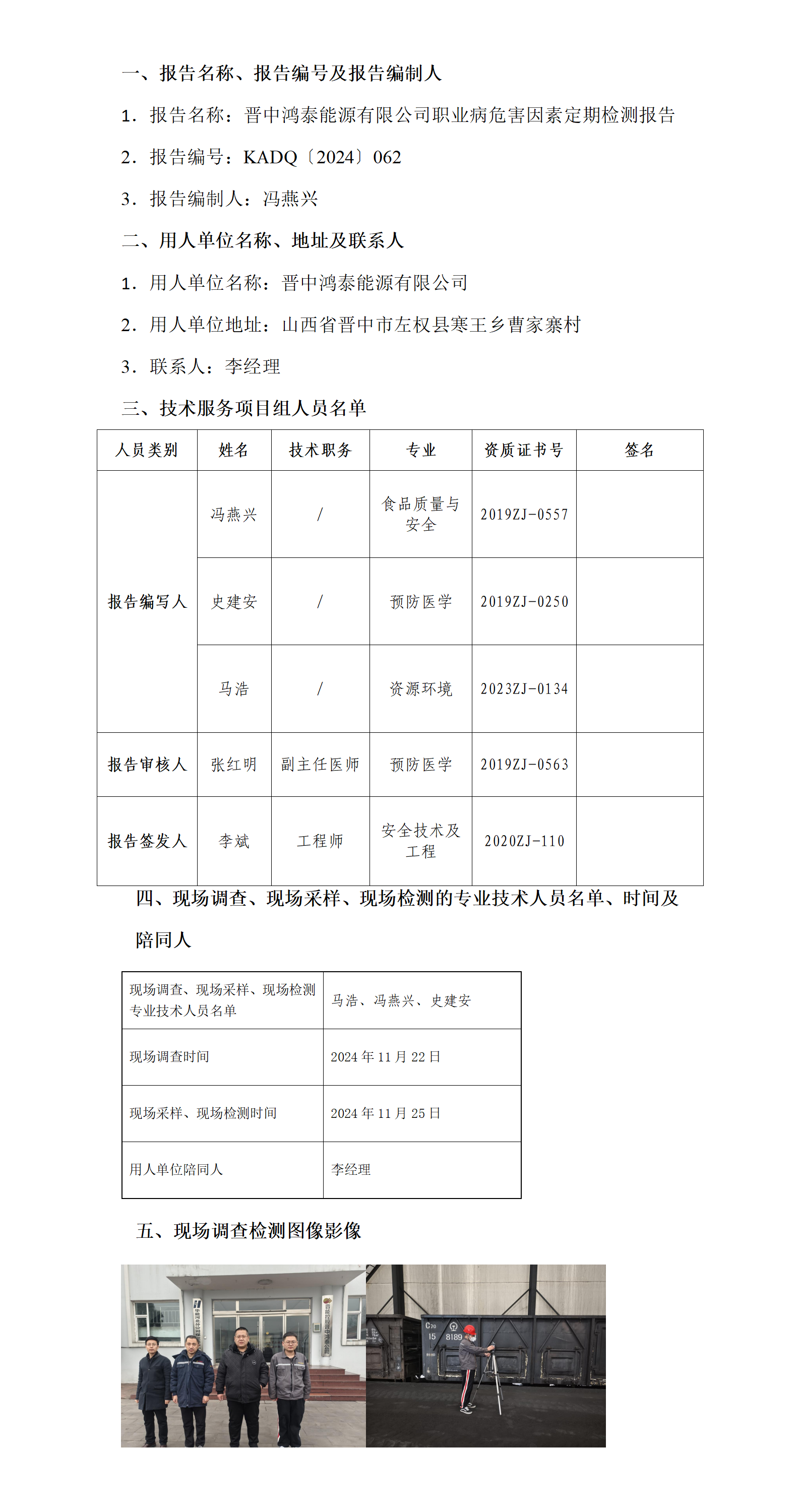 晋中鸿泰能源有限公司职业病危害因素定期检测报告