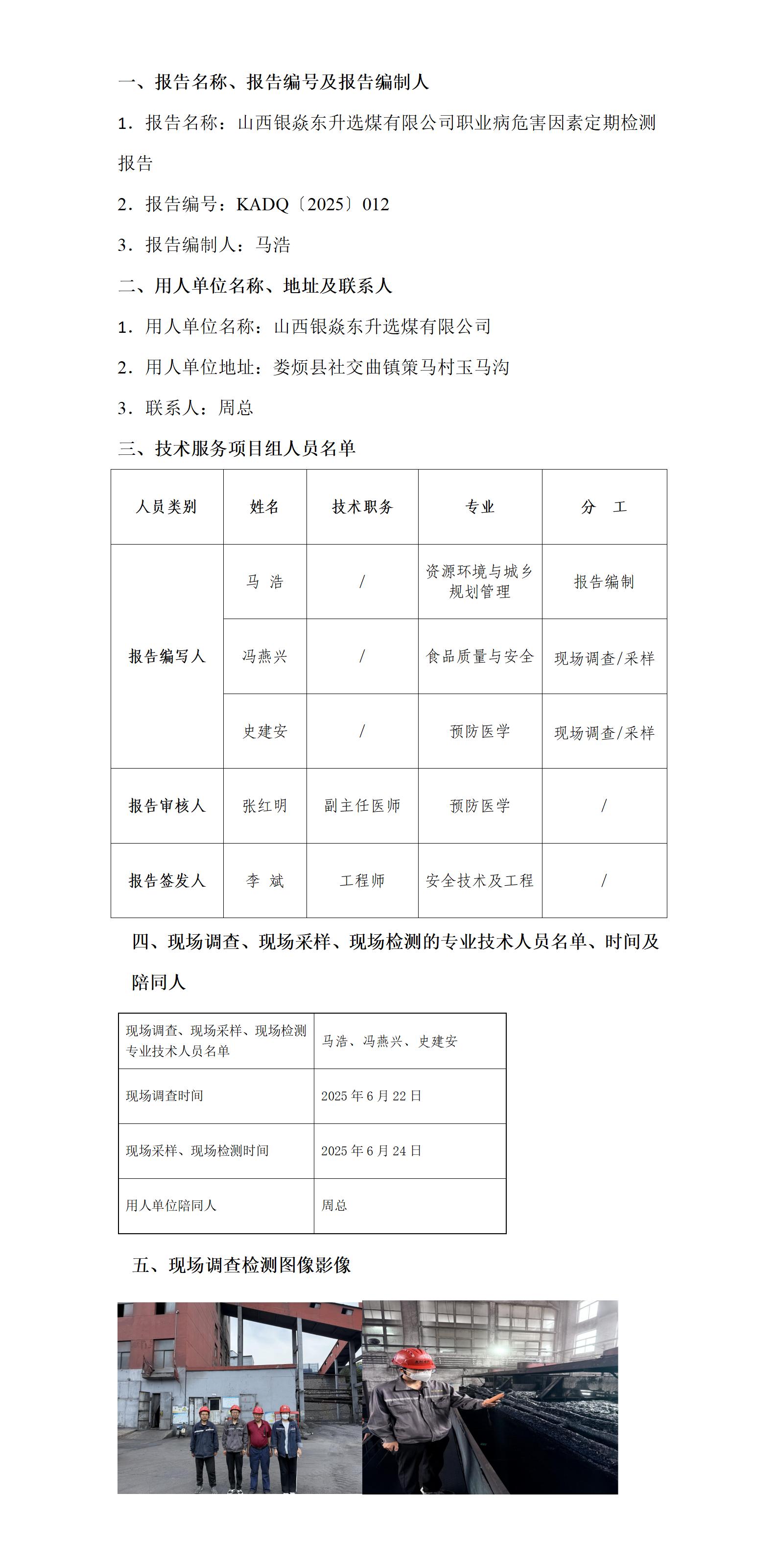 山西银焱东升选煤有限公司职业病危害因素定期检测报告