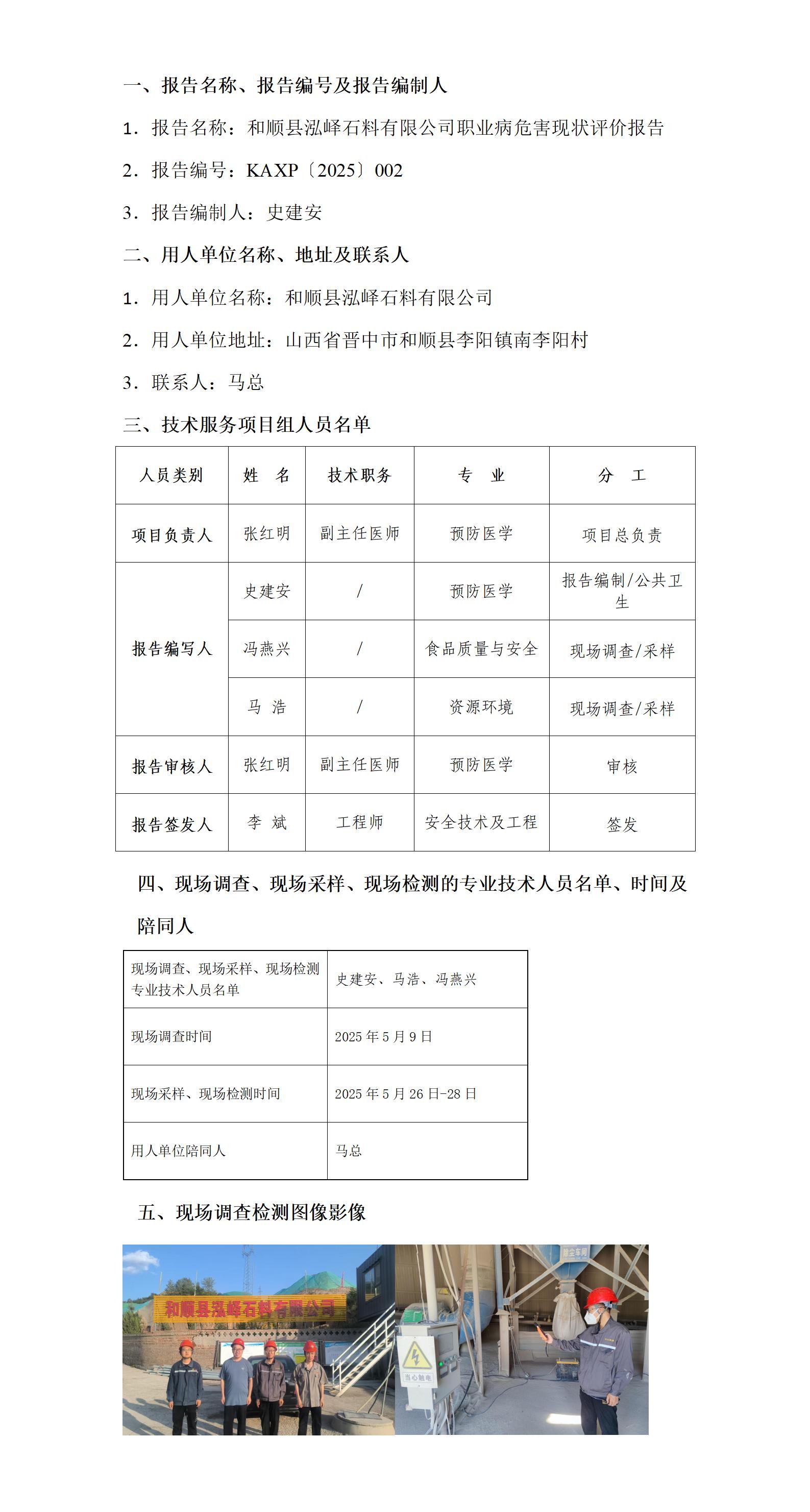 和顺县泓峄石料有限公司职业病危害现状评价报告