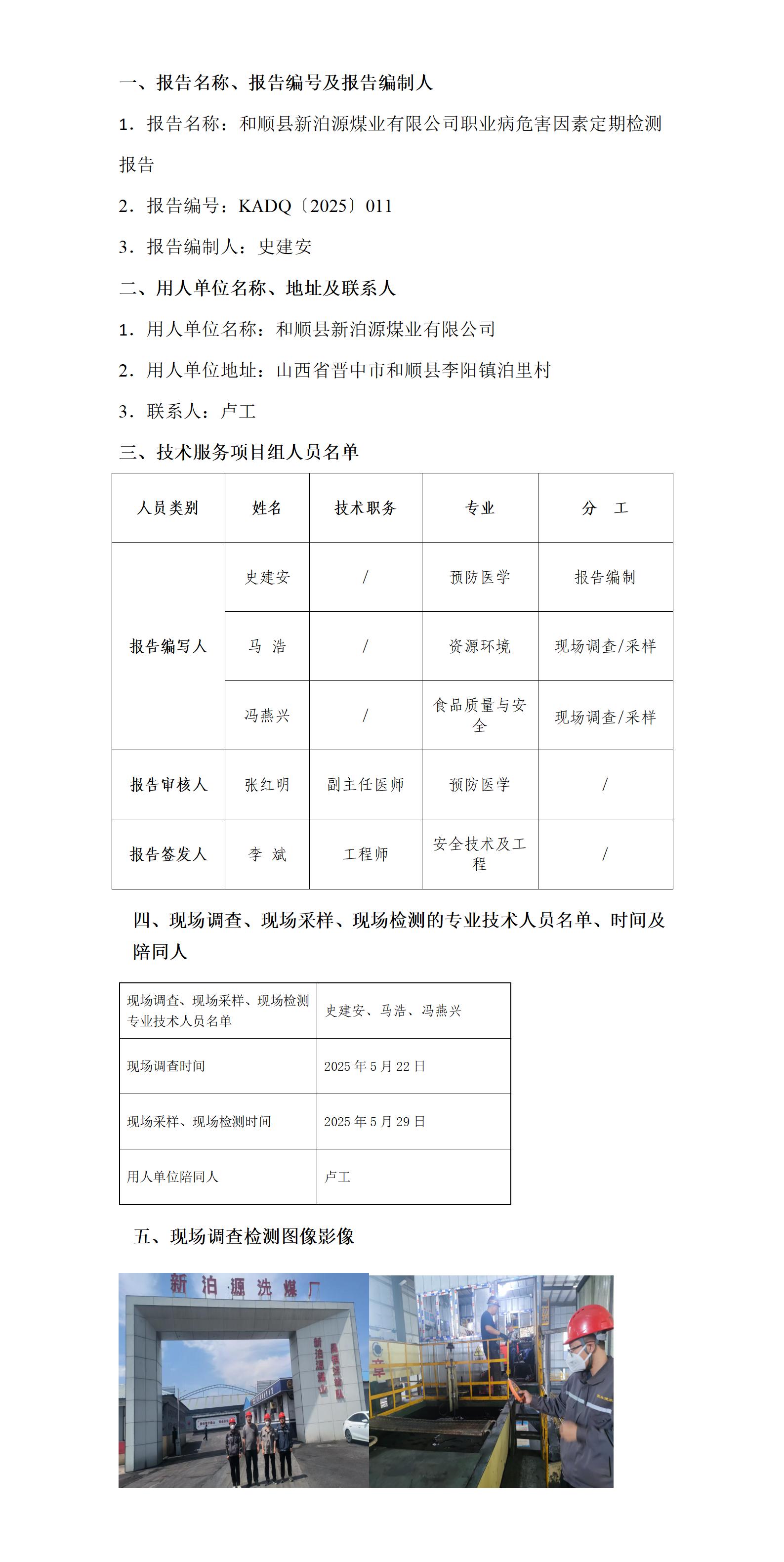 和顺县新泊源煤业有限公司职业病危害因素定期检测报告