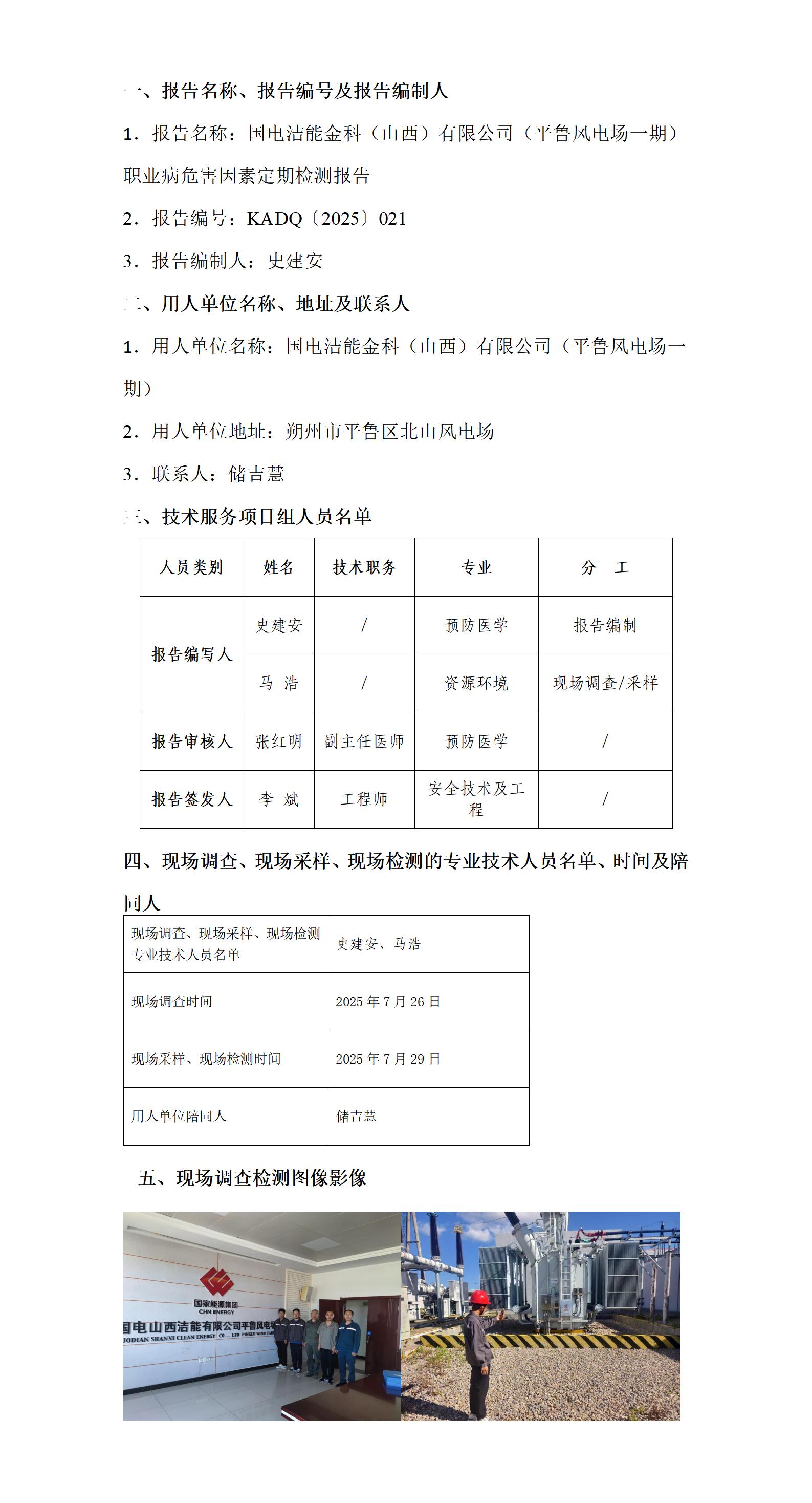 国电洁能金科(山西)有限公司(平鲁风电场一期)职业病危害因素定期检测报告