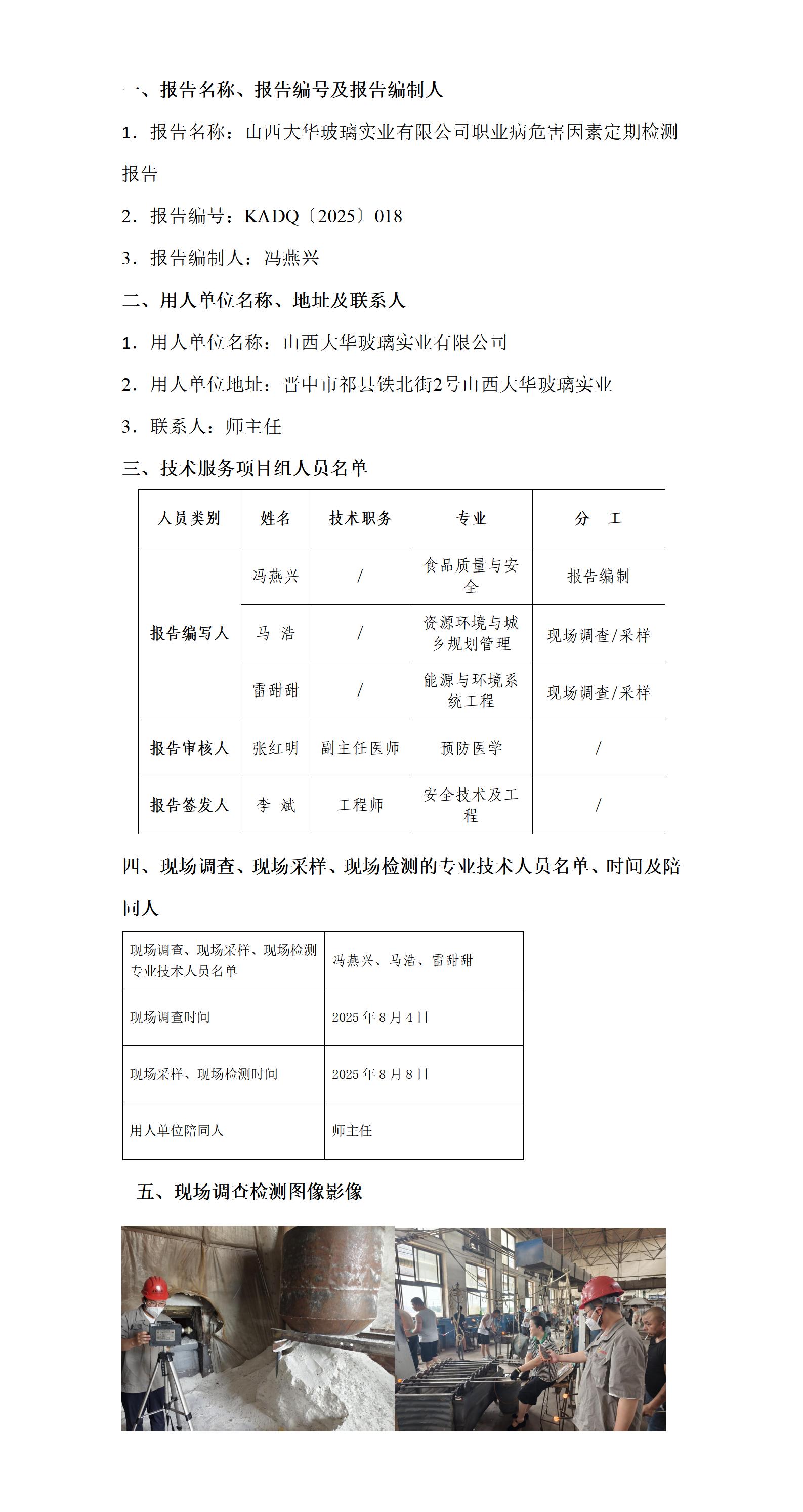 山西大华玻璃实业有限公司职业病危害因素定期检测报告