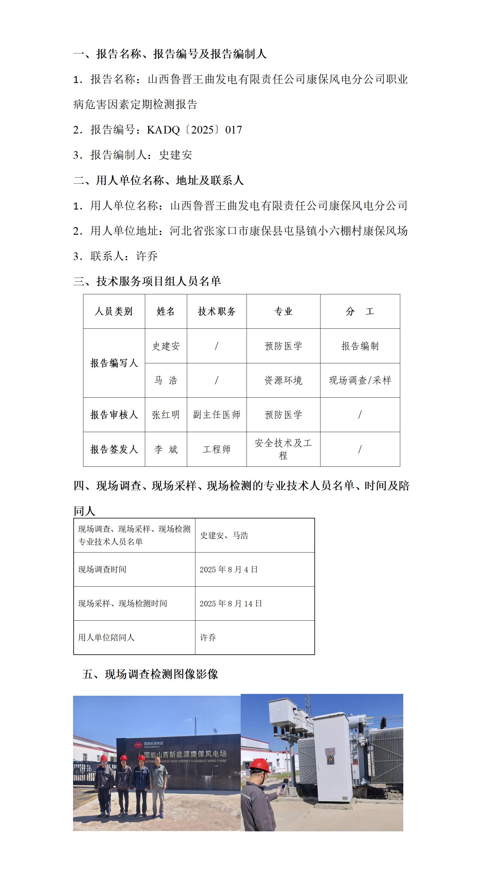 山西鲁晋王曲发电有限责任公司康保风电分公司职业病危害因素定期检测报告