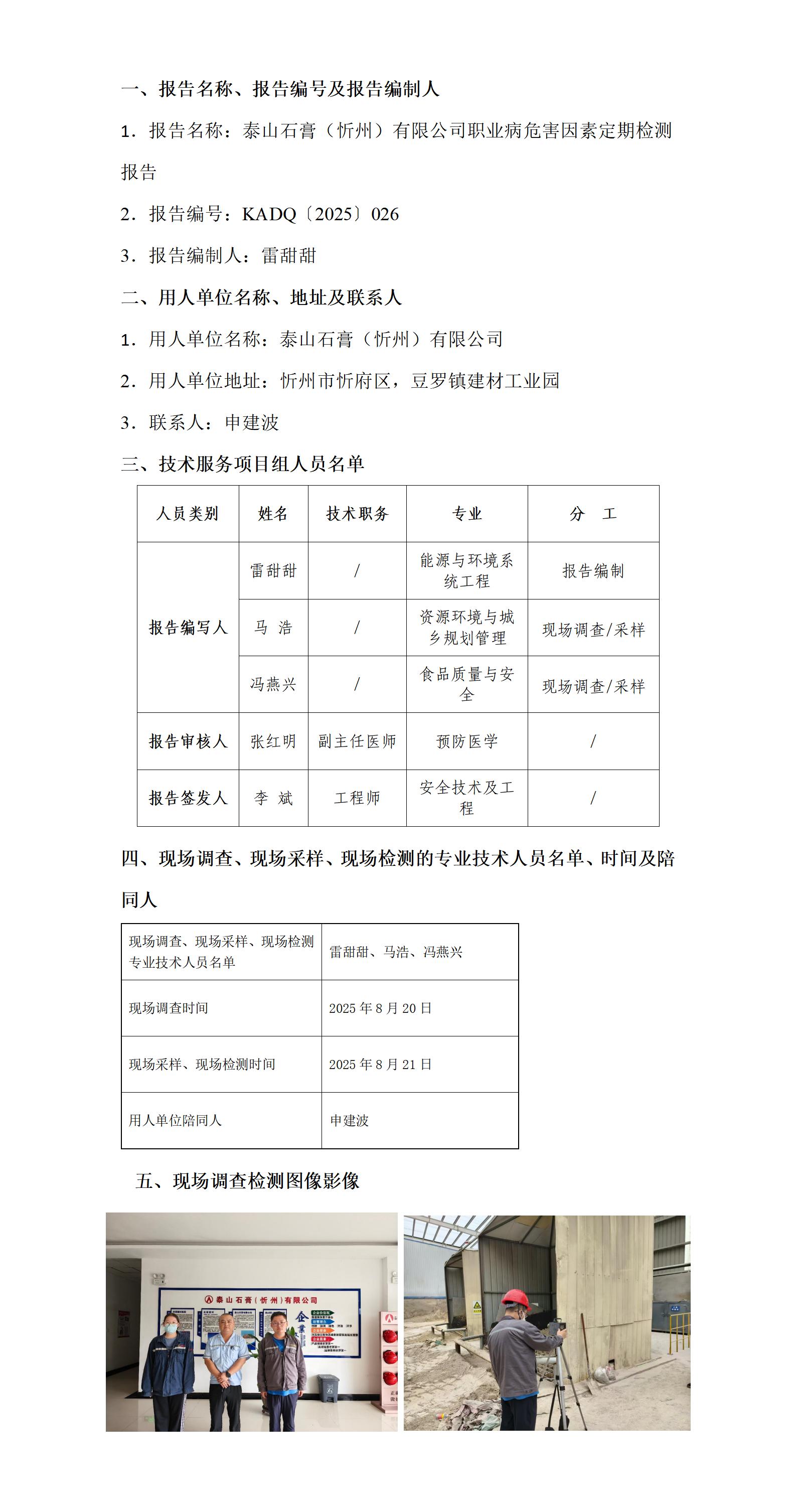 泰山石膏(忻州)有限公司职业病危害因素定期检测报告